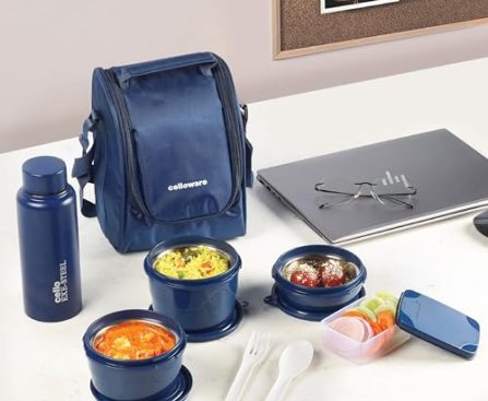Kitchen CELLO MF All in One Lunch Box with Jacket For Office Blue | 3 Microwave Safe Containers (550ml, 375ml, 225ml), 1x175ml Pickle Box & Steel Bottle 275ml | Leakrpoof Airtight Tiffin Box Set For Daily Use
