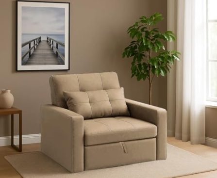 CASASTYLE Trissa 1 Seater Pull-Out Premium Fabric Sofa Cum Bed Sofa Set for Living Room (Beige Fabric) is available on Amazon. Product Description:- Product Dimensions: Length (36 inch), Width (34 inch), Height (34 inch) Primary Material: Fabric, Upholstery Material: Fabric Seating Capacity: One seater converts into a bed Assembly Required: The product requires carpenter assembly […]